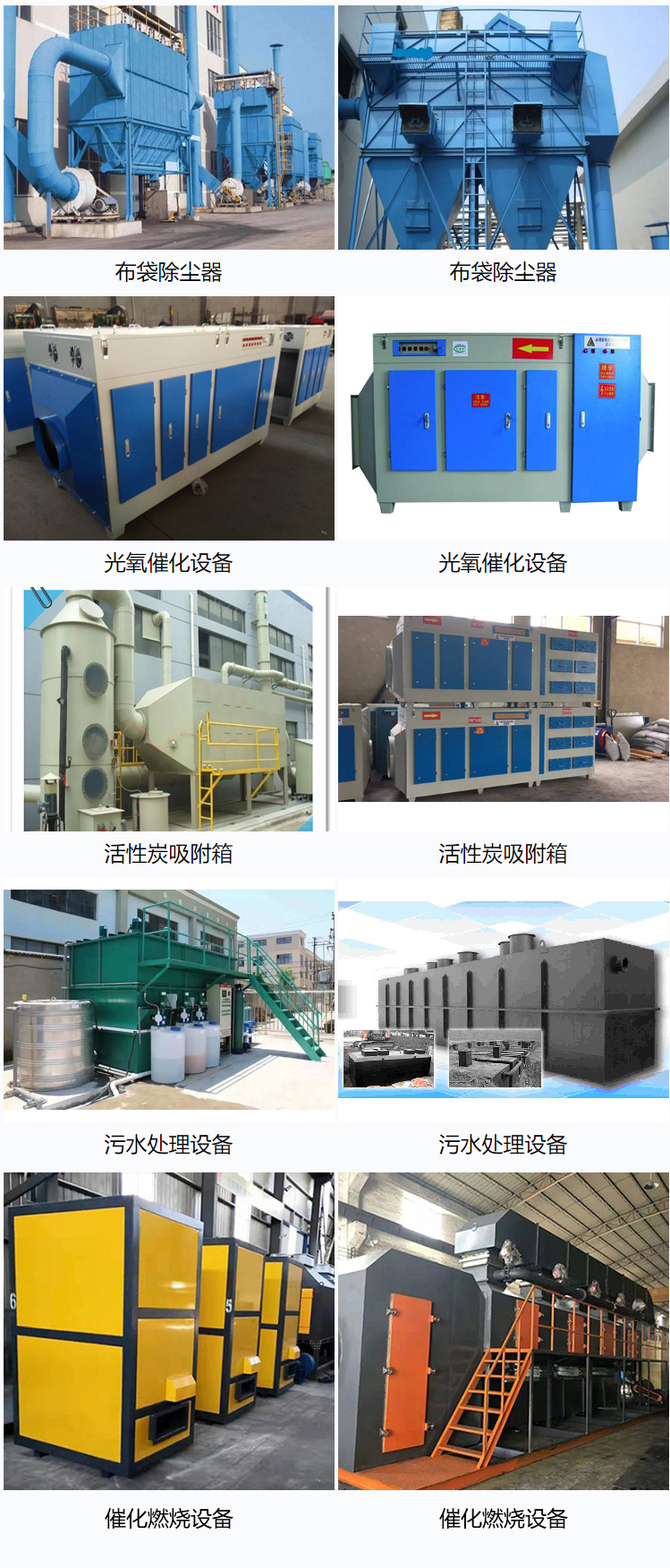 污水處理設備(地埋式污水處理設備、一體化污水處理設備)、廢氣治理設備(旋風(fēng)除塵器、布袋除塵器、濾筒除塵器)、有機廢氣處理設備(活性炭環(huán)保吸附、UV光氧催化設備、催化燃燒設備)